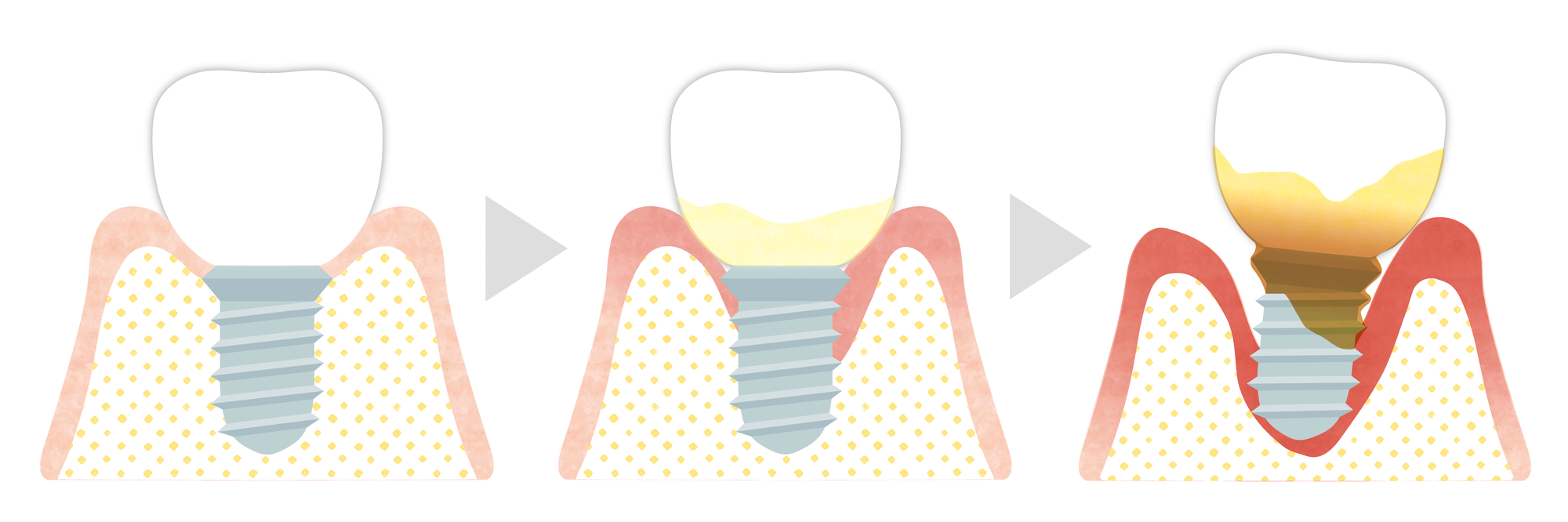 これは、歯周病菌が原因でインプラントの周りの歯ぐきや骨が炎症を起こすもので、放置するとインプラントを失う原因にもなります。
